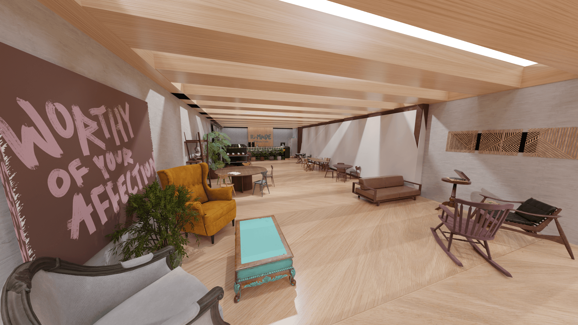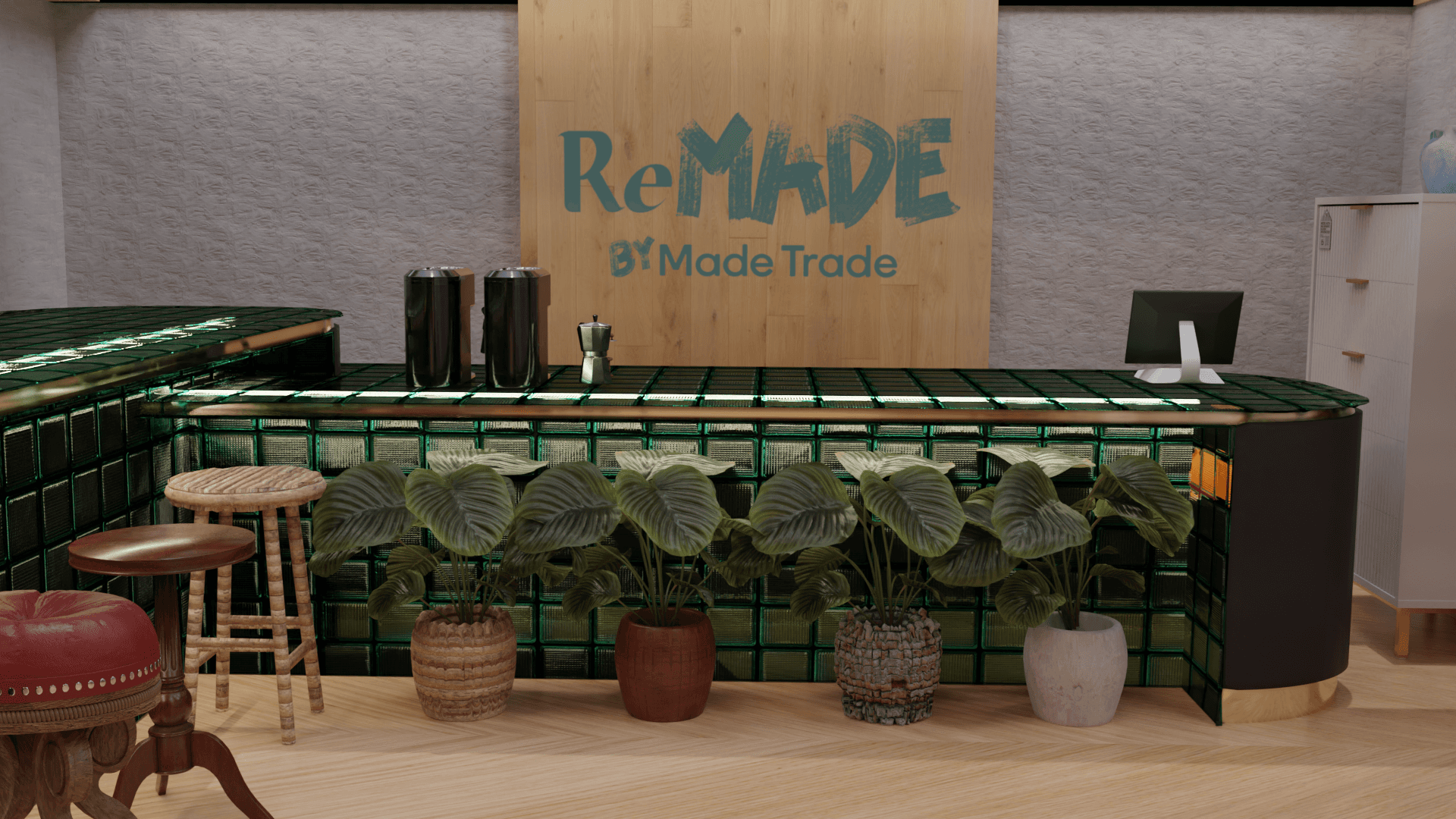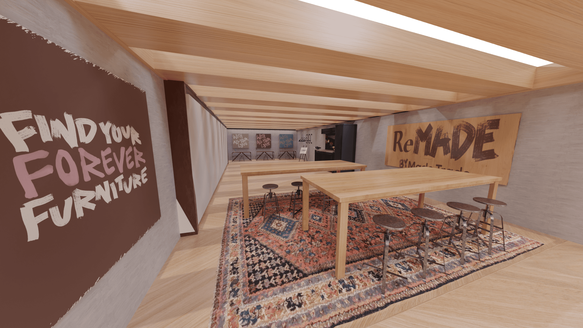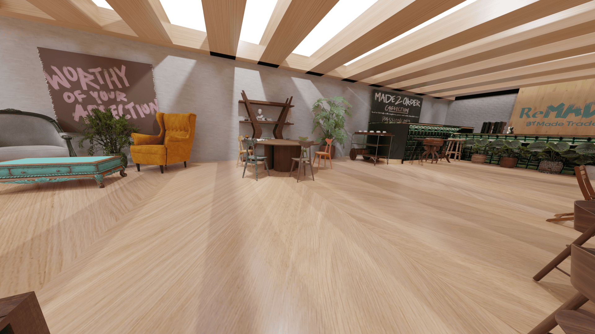 3D-modeled space exhibiting furniture refurbished by skilled makers. Each piece comes with a tag sharing the maker's story. Enjoy a coffee at the cozy bar while trying out future furniture.