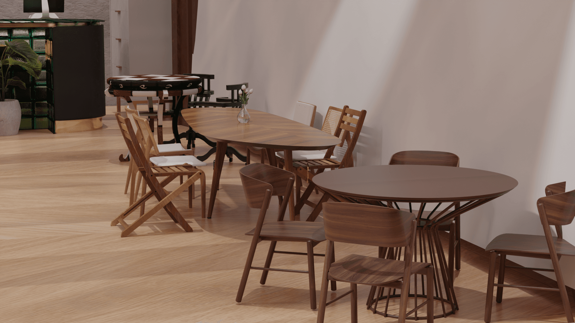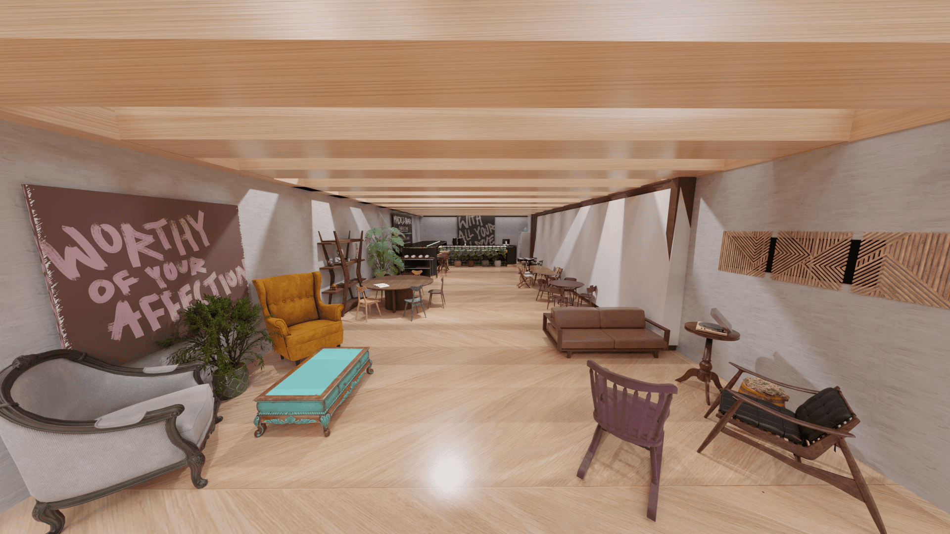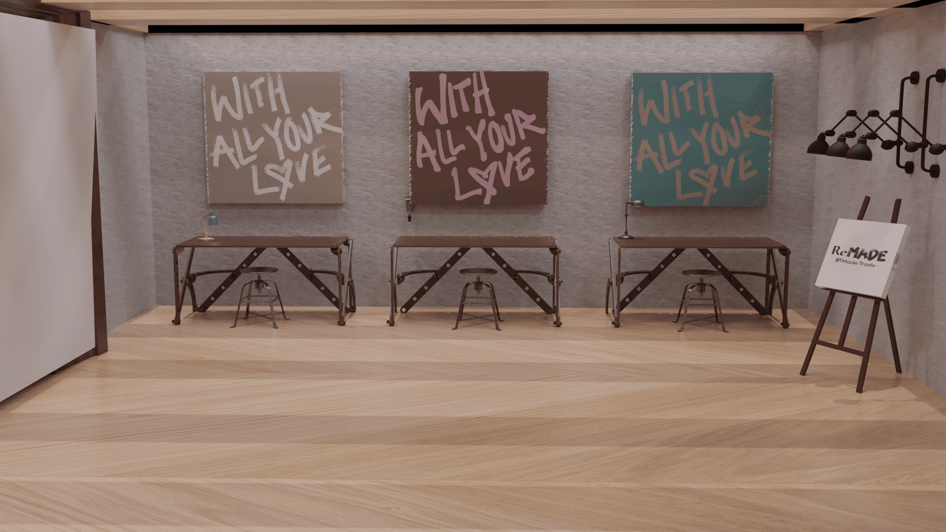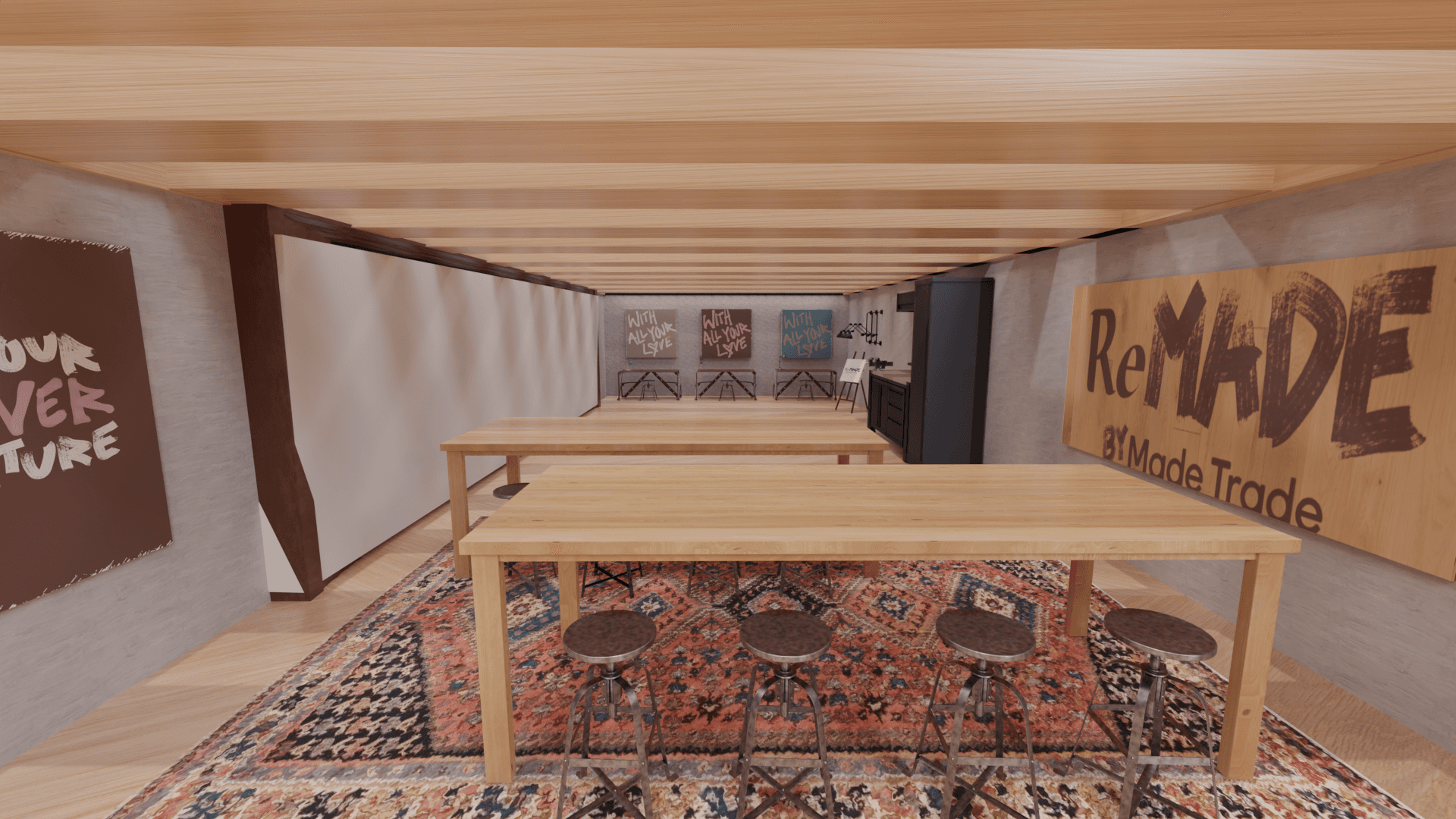3D-modeled space exhibiting furniture refurbished by skilled makers. Each piece comes with a tag sharing the maker's story. Enjoy a coffee at the cozy bar while trying out future furniture.