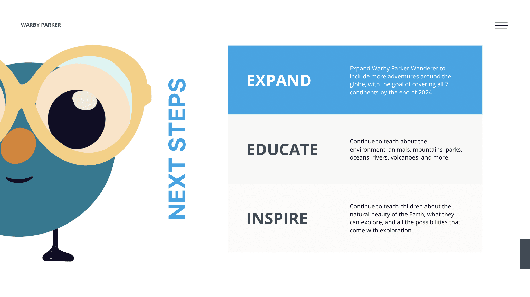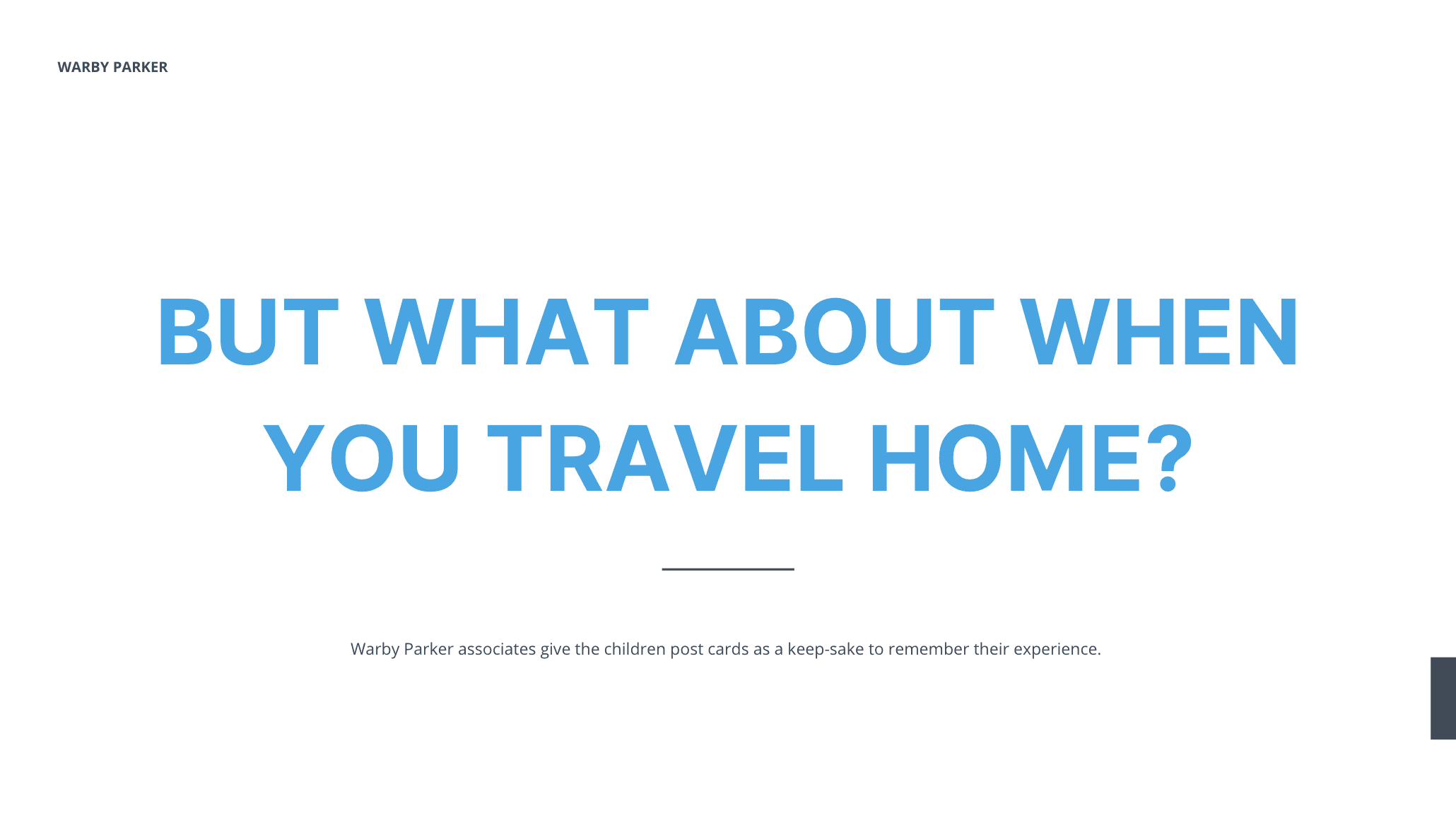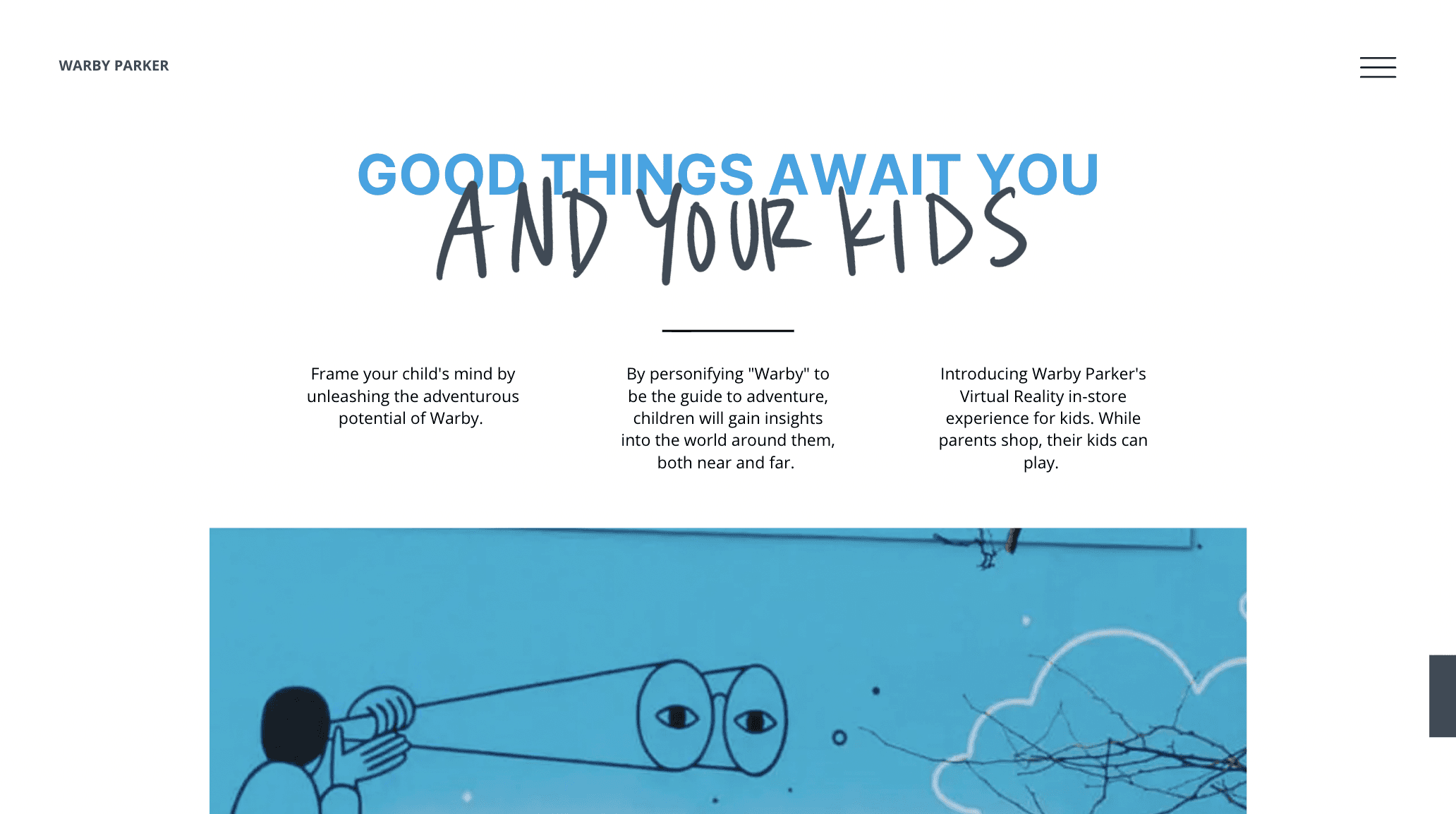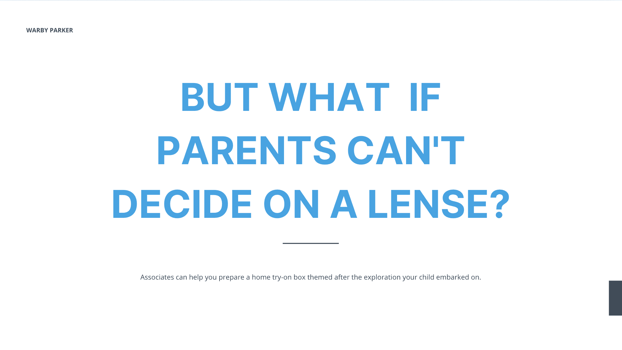 Warby Parker is geared towards adults, BUT what about when parents come in-store with their children? How might we create an in-store experience for children that educates and engages them while their parents shop, considering that parents will want their child with them while shopping, but keep them busy at the same time.